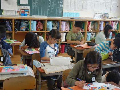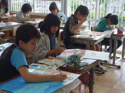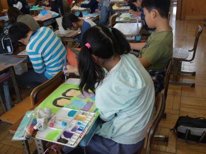 5年生の図工です。「じっと見つめてみると」という単元で、一人一人が題材を決めてじっと見つめて絵に表しています。道具、生き物、建物などなど、いろいろな作品ができあがっています。
