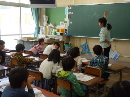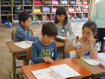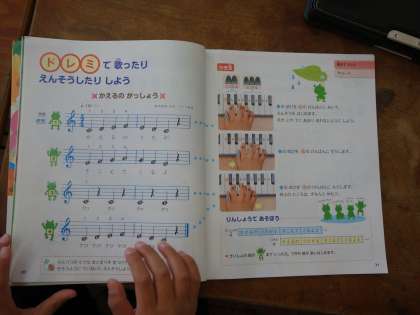 2年生の音楽です。「かえるのがっしょう」を鍵盤ハーモニカで演奏します。今日は教科書の楽譜を見ながら、手の動きを隣の席の友達と見合って、確認していました。実際に演奏するのが楽しみです。