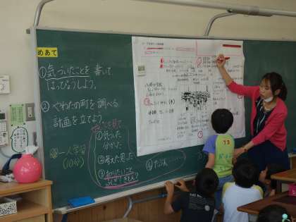 3年生の社会科で、わたしたちのまちの様子についての学習が進んでいます。学校から見て、東西南北の各方角にどんなものがあるか調べてきましたが、今日はそのまとめをしていました。みんなで調べたことをもとに学級全体でまとめてみると、八幡には本当にたくさんの建物や施設があることがわかりますね。
