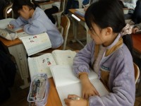 3年生の外国語活動の様子です。年間15時間しかない学習ですが、「Let’s try!」というテキストを使って英語の学習をしています。世界のあいさつ、自己紹介など、少しずつ英語に慣れ親しんでいきます。