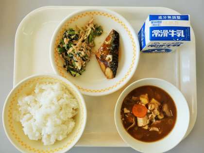 きょうはさつま汁。サツマイモが入っているみそ汁です。そして、こってりとしたおいしさのサバの照り焼き、さっぱりとしたおいしさの小松菜ともやしのごまあえがついていて、充実した献立です。