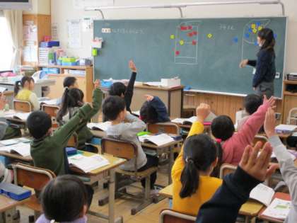1年生の算数です。ここでは、100までの数の概念を身につけます。具体物を10ずつまとめて数えたり、10のまとまりがいくつとばらがいくつということを考えたりします。今日は、点数を比べてどちらが大きいかを具体的に考えていました。10進法の基礎の部分ですから、しっかり身につけましょう。
