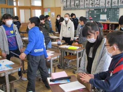 5年生の算数です。割合の学習が進んでいます。今日は、百分率を使った問題に挑んでいました。例題は、「ねだんが15000円のカメラを10%引きで買うときの代金はいくらか」です。思わず「1500円!」と答えたくなりますね。友だち同士で意見を交流し、思考を深めていました。