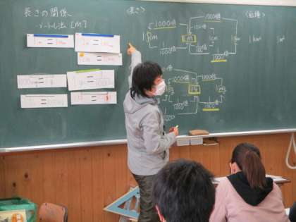 6年生の算数です。5年生までに、重さ、面積、体積、時間、角などの量の意味を学習してきました。ここでは、メートル法について学びます。今日は、長さと面積・体積の単位間の関係をまとめていました。一つずつ納得して進んでいきましょう。