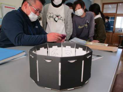 5年生の図工です。ここでは、動きが連動して見えるアニメーションの仕組みを生かして、楽しい作品をつくります。今日は、まず、アイデアスケッチに挑戦です。先生の前にある道具に10枚の絵を貼り付けて回します。この道具って、NHKの朝の連続テレビ小説「半分、青い」で見た気がしますね。