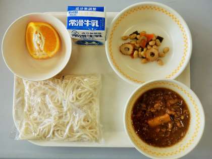 ソフトめん 肉味噌かけ 五目煮豆 いよかん 牛乳