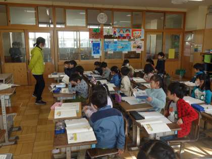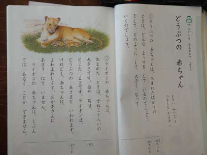 1年生の国語です。「どうぶつの赤ちゃん」という説明的な文章の学習に入りました。ライオンやシマウマについて知ることができる話ですが、文章の組み立てについても学びます。今日は、「しつもん」にあたる文について、考えていました。
