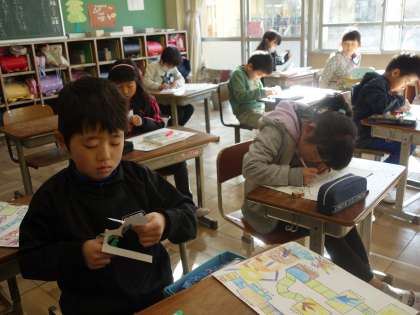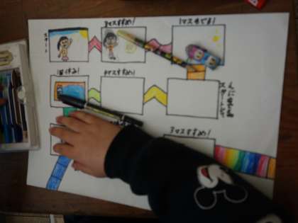 2年生の図工で、「わくわくすごろく」という楽しい活動をしています。図工ですが、すごろくを作るということは、まるで国語のようにストーリー展開を考えることになりますね。もちろん、絵を入れたり、さいころを作ったりと、図工としての楽しい活動が盛りだくさんです。完成が近い子もいますね。