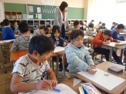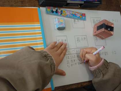 2年生の算数です。「はこの形」という学習に入りました。実際に箱を見ながら、いくつの平面が集まってできているのか、どのような平面が集まってできているのか確認していました。ノートにかきうつしてみて、あらためて発見があったようです。