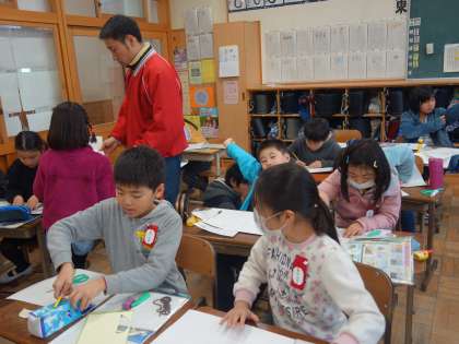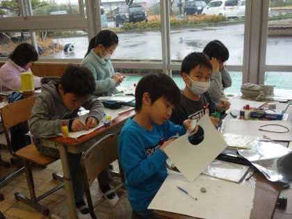 3年生の図工です。紙版画「いろいろうつして」という学習です。1年間の楽しかった場面を思い浮かべて下絵を描き、そこにさまざまな模様の紙を貼り付けていました。完成したときをイメージし、丁寧に貼り付けていました。