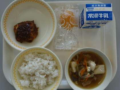 麦ごはん 牛乳 けんちんしのだの肉みそかけ 沢煮椀 冷凍黄桃
