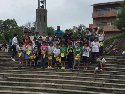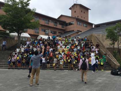 時間よりも早く旭高原少年自然の家に到着しました。まずはクラスごとに写真撮影、学年でも全体写真を撮りました。