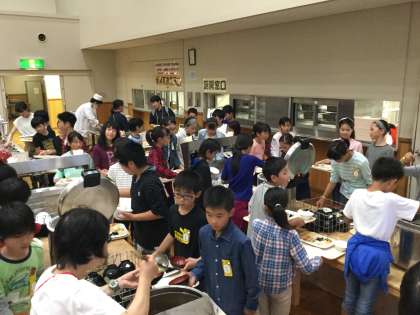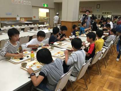 夕食の時間になりました。ビュッフェ式で、子どもたちは何度もおかわりしていました。きっとかなりお腹が空いたんですね。この後はキャンプファイヤー…なのですが、雨が降り始めてしまいました。現在決行か否か、判断中です。