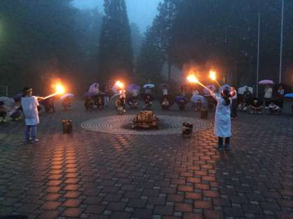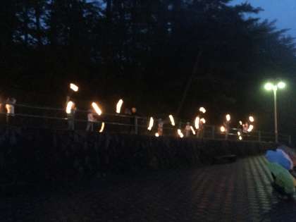 キャンプファイヤーは生憎の雨になりましたが、本降りではないこと、これまで頑張ってきた子どもたちのことを考え、ファイヤーやトーチ、火文字は行いました。霧がかった中でのトーチはとても幻想的でした。ファイヤー係の人たちにみんなは大きな拍手を贈っていました。その後は体育館でキャンドルファイヤー。クラスごとの出し物も大盛り上がりでした。