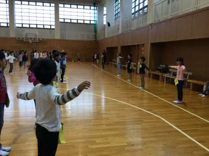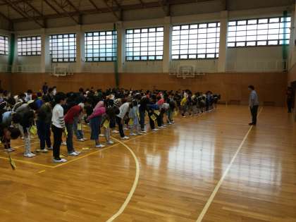 子どもたちは元気一杯です。現在、朝の集いの最中です。ラジオ体操やスピーチ担当の児童は、一生懸命に役割を果たしていました。