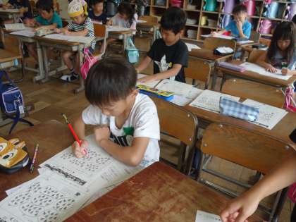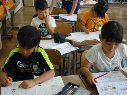 2年生が算数の授業で復習をしています。1000までの数テストのなおしやくり上がりのたし算、くり下がりのひき算、長さ、時間などの復習プリントの直しを行っています。一人ずつ先生に見てもらっています。直しを行う表情も真剣そのものです。テストの点数も大事ですが、そうやって分かるようになることがうれしいですね。