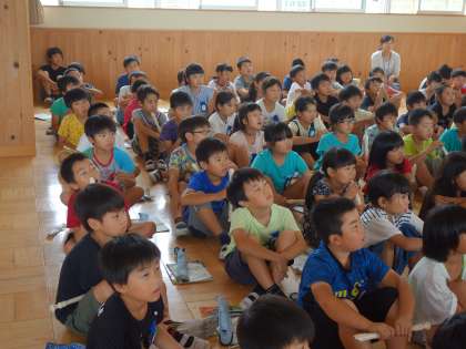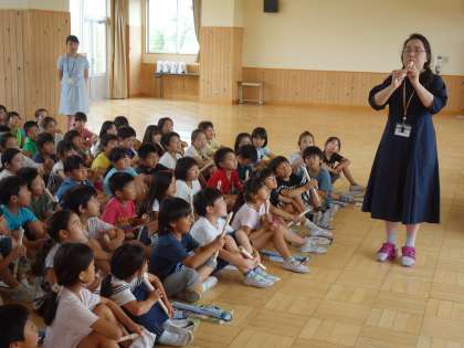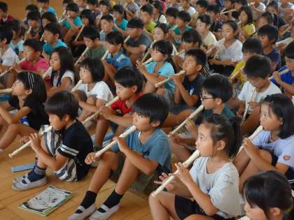 3年生が音楽の授業で、この1学期から始めたリコーダーの基本について確認しています。袋の出し入れ、つばぬき、姿勢、くわえ方、笛星人(リコーダー教則本)などを学年全員でそろえています。角度や唇の合わせ方など細かなことを教えてくださるので、先生の話に熱心に聞き入っています。