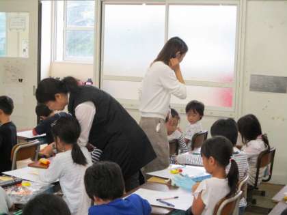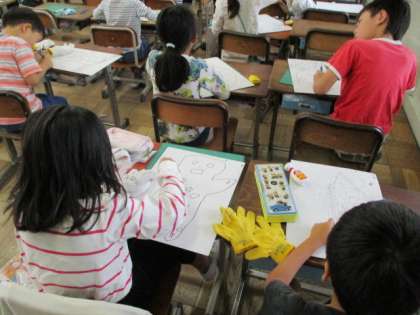 2年生の図工です。ここでは、光を通して映る形や色の見え方、見え方の変化を楽しみます。最後は、教室の窓ガラスに作品を貼ります。今日は、まず、動物や建物などの下絵を描き、カッターナイフを使って光を通す部分を切り取っていきました。先生の話を聞く姿勢も、カッターナイフの扱う姿も真剣そのもの。安全に気をつけて、すてきな作品に仕上げてくださいね。