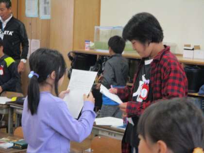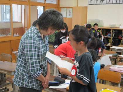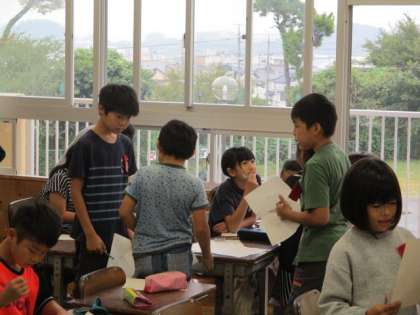 4年生の社会です。ここでは、過去の先人の働きや生き方にふれながら、地域社会に対する誇りと愛情を育むことを目指します。これまで、愛知用水をキーワードに、自分で課題を設定して調べを進めてきました。今日は、自分の調べてきたことを友だちや先生に説明したり、聞いたりする活動です。自分の言葉で、いっしょうけんめい話す姿を見ることができました。