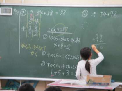 2年生の算数です。今日の学習は、たし算の筆算です。5月に、34+12のように、答えが100より小さいたし算の計算の仕方について学習しました。ここでは、54+72のように、答えが100より大きい計算について学びます。ちがいは何かを考えながら、けたをそろえて計算することを学んでいました。しっかり復習しましょう。