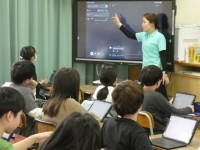 5年生の算数です。体積の練習問題を解いています。体積が1立方センチメートルの立方体の積みあげや、コの字型の建物の体積、水槽に入れた水の量などを計算しています。先生に合格をもらうまではドキドキです。友達と確認し合ったり、教え合ったりしています。