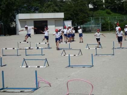 4年生の体育です。全部で8コースの設定されている中から、自分で選択して、ハードル走の練習をしています。やや高いハードル、低いハードル、斜めハードル、逆さハードル、ラダー、リングなどのコースを走ることで、スピードを落とさずにできるよう歩幅や踏み切った足の動きを工夫しています。
