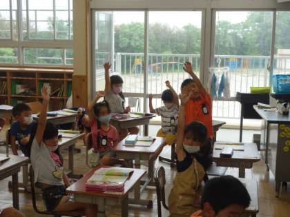 1年生の算数です。さまざまな動物を絵の中から見つけて、どこにいるか言葉で説明できるようにしています。「みぎから○ばんめ、ひだりから□ばんめ」と両方から数えています。「はい、〜です。」という答え方も身に付いてきました。