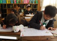 2年生の算数です。大きな数、たし算・ひき算の筆算、九九を利用する問題、買い物の問題などの復習をしています。これまでいっしょに過ごしてきた仲間同士、「もうすぐ3年生」という気持ちで、教え合っています。