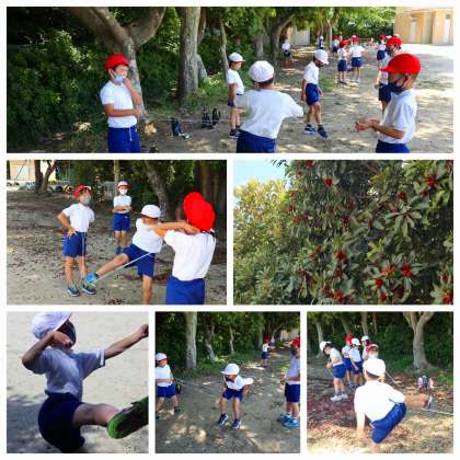 運動場南はヤマモモの木が木陰をつくっています