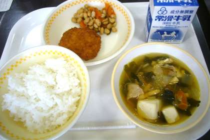 ぶたにく、あぶらあげ、とうふ、わかめ、にんじん、ねぎ、たまねぎ、じゃがいもと、本当に実がたくさんの「みだくさんじる」。