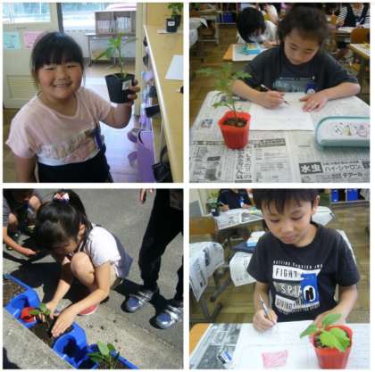 買った苗は、観察した様子をきろく用紙に書いたりはちに植えたりしました。