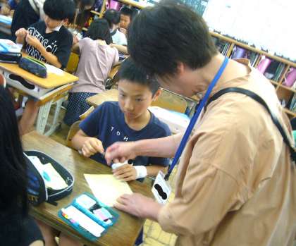 今日も昨日とは違う学級にボランティアの方に補助に入っていただき、「玉どめ・玉むすび」をしました。