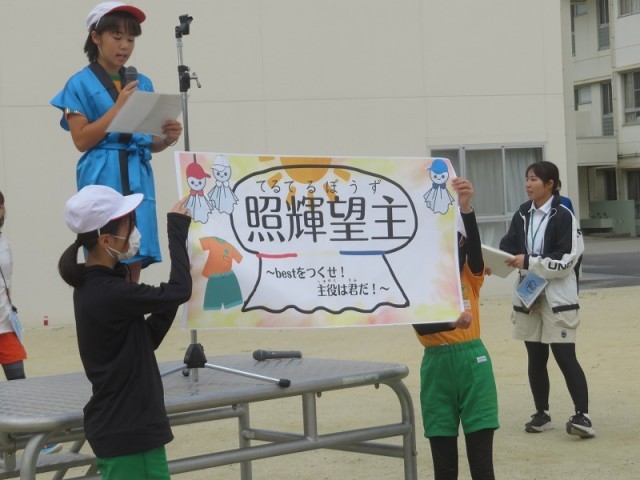 運動会のスローガン「照輝望主てるてるぼうず」で乗り切りましょう。