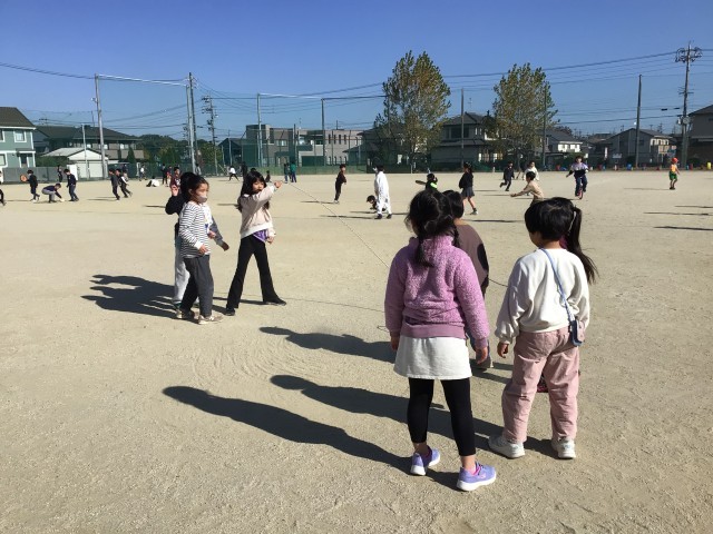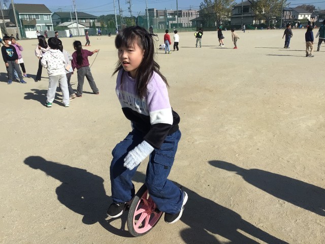 運動場はボール遊び、縄跳び、一輪車などで遊ぶ子どもたちでいっぱいです。