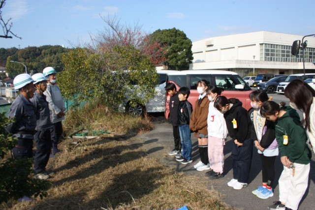 令和2年度にキンモクセイ、ハナミズキ、ハナモモを植樹してくださった公益財団法人 名銀グリーン財団、青山造園の方が来校し、新たに正門横にキンモクセイ、農園にキンカン、ブルーベリーの木を植樹してくださいました。児童会が植樹作業の最初に立ち会い、お礼の言葉を伝えました。