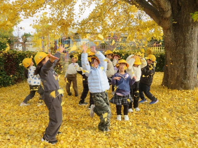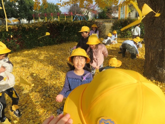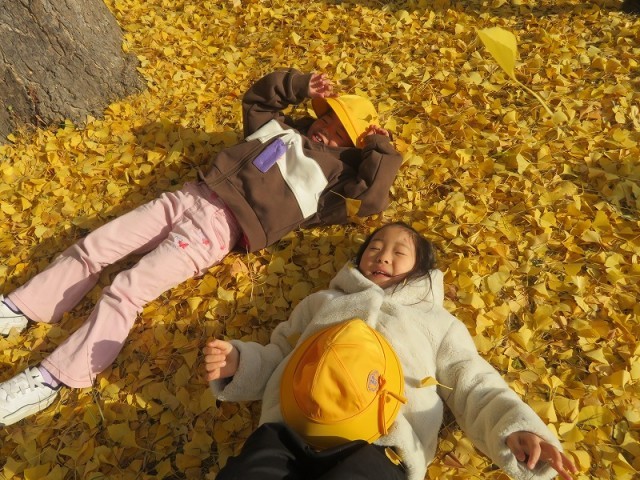 寝っ転がったり、「せーのーで」と言いながらイチョウのシャワーを浴びたりしていました。