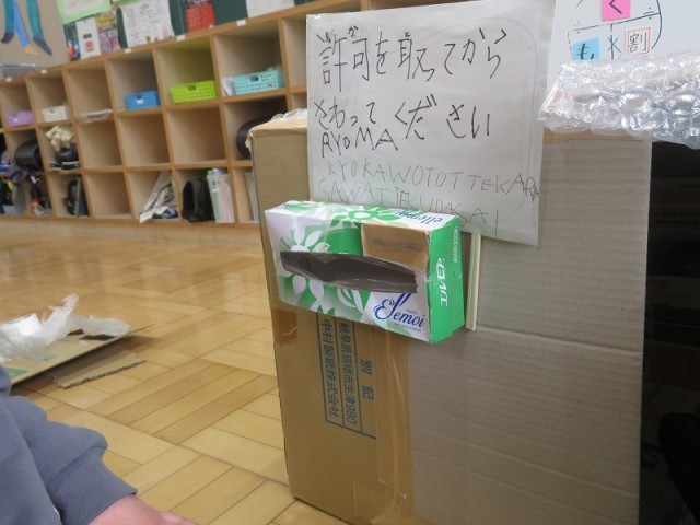 ティッシュの箱を使ったポスト、洗濯ばさみで吊り下げられた表札、