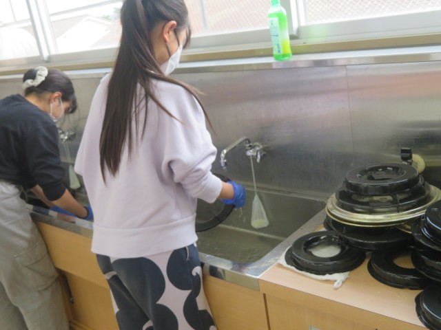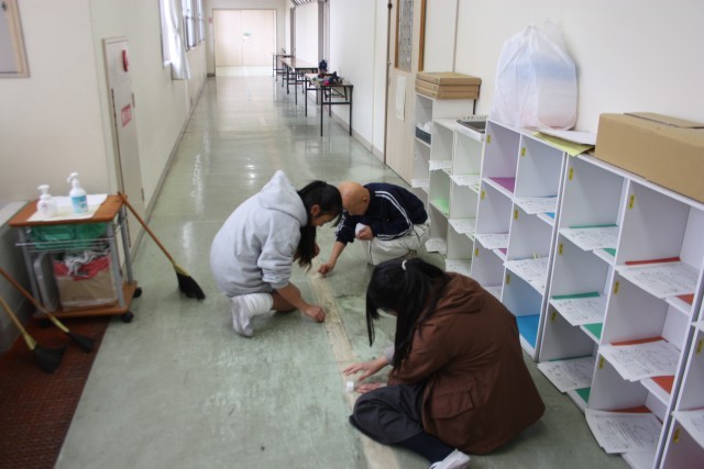 トイレの床掃除、階段、廊下、保健室前側溝の掃除、家庭科室のガスコンロの汚れ落とし、遊具のペンキ塗り、体育館と運動場の体育倉庫、理科室の床・机緒の掃除、に分かれて時間のある限り、一生懸命作業に取り組みました。日頃、清掃したり整えたりする機会の少ない場所に取り組んでくれました。