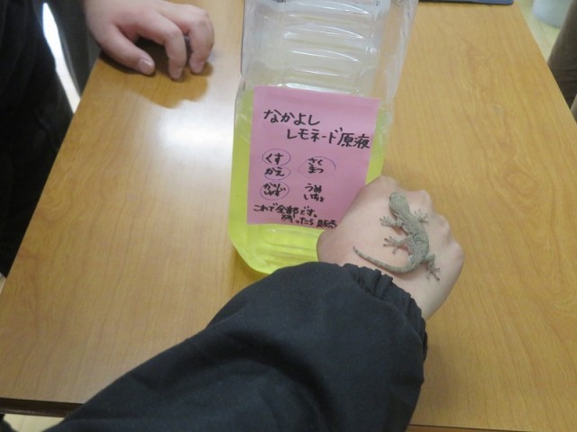 手にはヤモリが。