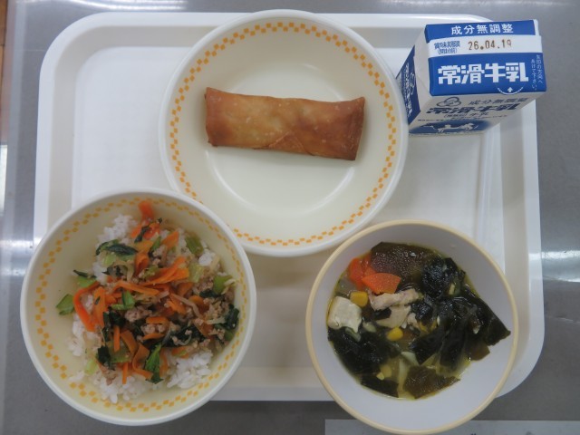 本日のメニューは、「ごはん、ぎゅうにゅう、しそいりとりはるまき、ビビンバ、わかめスープ」でした。ビビンバは、子どもたちの人気メニューです。どの学級もしっかりと食べられました。