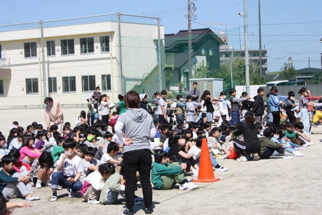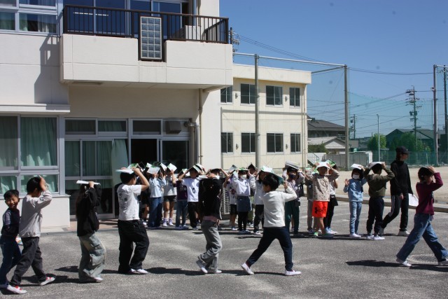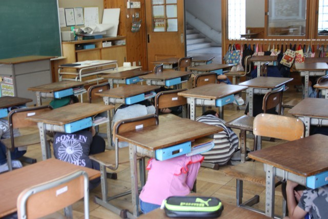2時間目に地震避難訓練を行いました。一次避難で、素早く机の下に潜り頭を守り、二次避難で静かに迅速に運動場まで避難することができました。