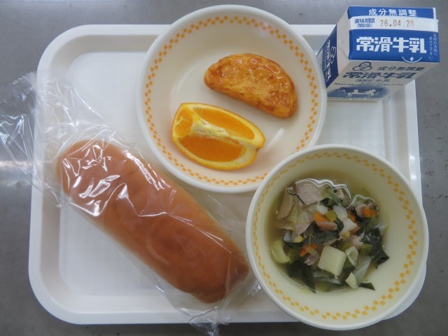 本日のメニューは、「ロールパン、ぎゅうにゅう、オムレツのトマトソースかけ、やさいスープに、オレンジ」でした。今日もおいしくいただきました。「オレンジがおいしかった」「オムレツが好き」という声もいっぱい聞きました。