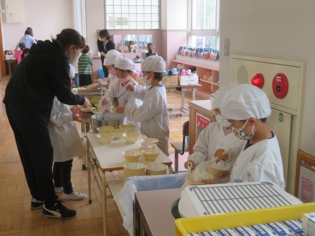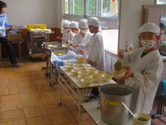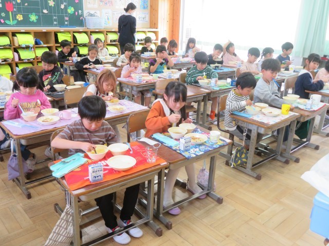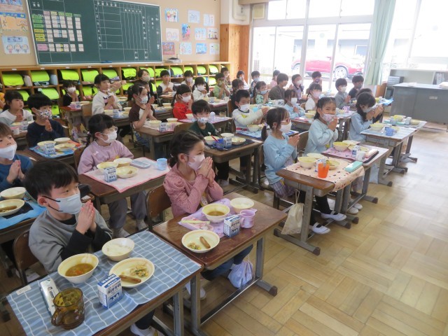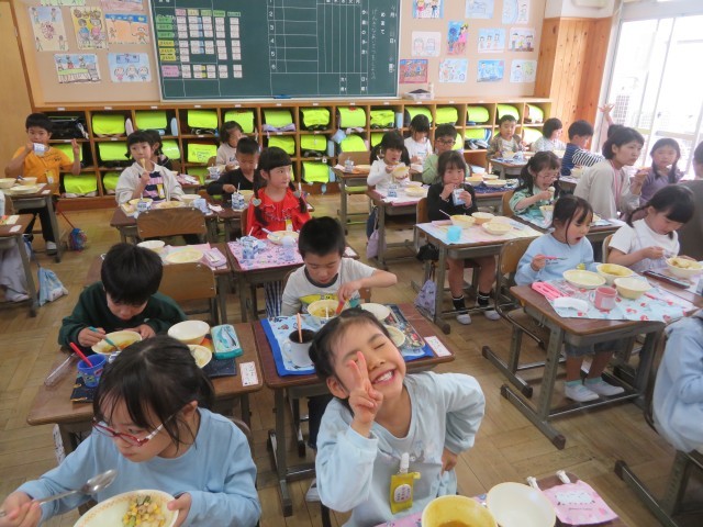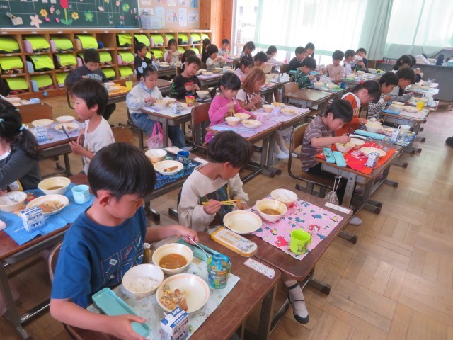 1年生にとって、小学校での初めての給食でした。「ウインナーがおいしい」「カレーすきー」「カレーおかわりしたー」など元気な声を聞かせてくれました。1年生のみなさん、これからもしっかり食べられるといいですね。