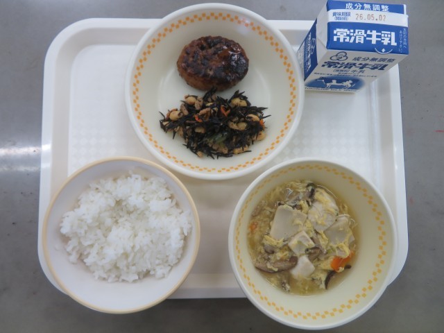 本日のメニューは「ごはん、ぎゅうにゅう、てりやきハンバーグ、ひじきとだいずのいために、かきたまじる」でした。てりやきハンバーグは絶品でした。子どもたちも大満足だったようです。