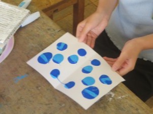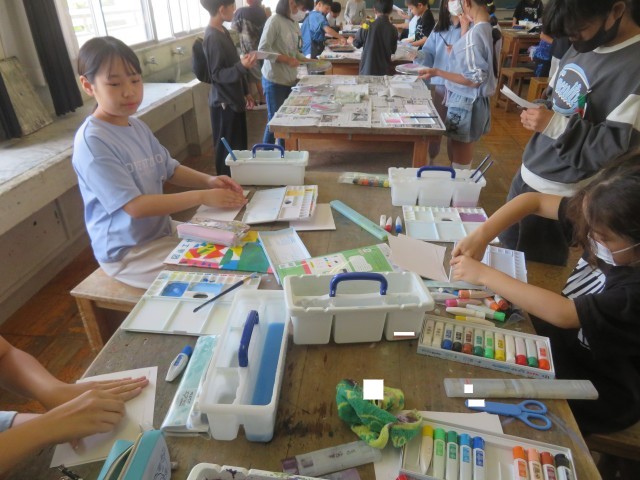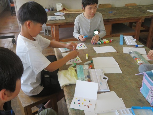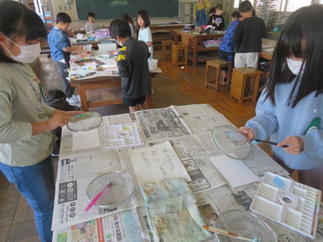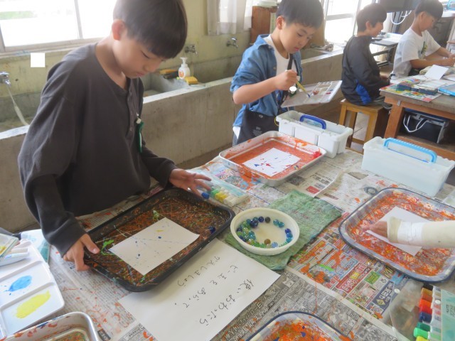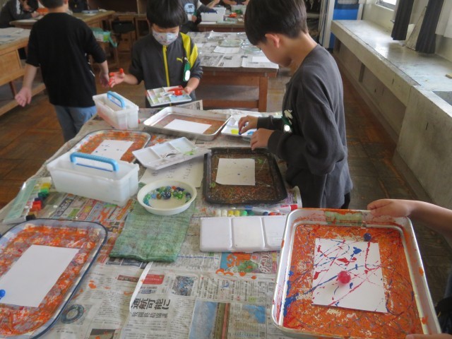図工室をのぞくと、とても楽しそうに活動していました。スパッタリングやデカルコマニー、ビー玉などを使って、さまざまに絵の具を使った表し方を楽しみながら学習していました。これからの作品作りに生かせるといいですね。