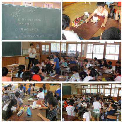 3年生が風やゴムで動く力について学習していました。机の上に手作りの車を用意し、互いに聞き合いながら課題を追究していました。