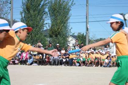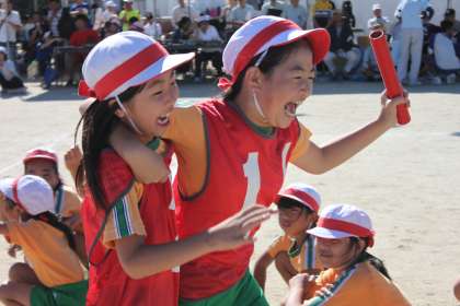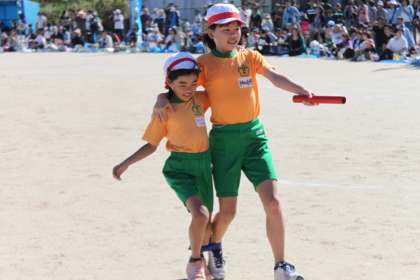 ペアで二人三脚。チームの優勝目指して、必死でバトンをつなぎます。
