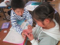 5年生が電磁石の実験をしていました。電流の強さを変えることで,電磁石の強さが変わるかを調べます。電流計を回路につないでアンペア数を確かめていました。上手に結果が出るといいですね。