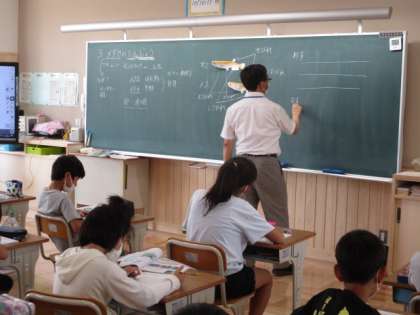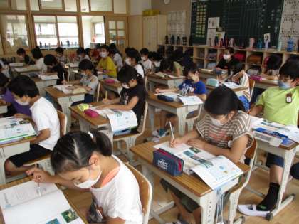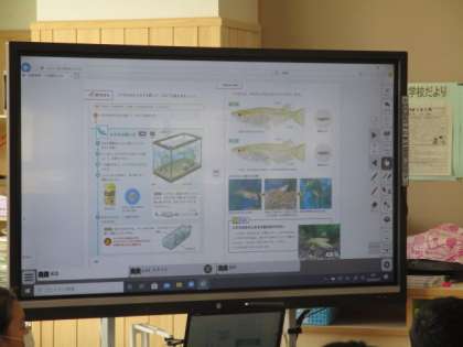 5年生はめだかの誕生を学習しています。今日は、オスとメスの違いについて調べていました。廊下には、先日卵から生まれた赤ちゃんが元気に泳いでいました。