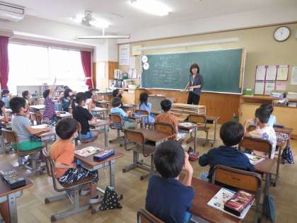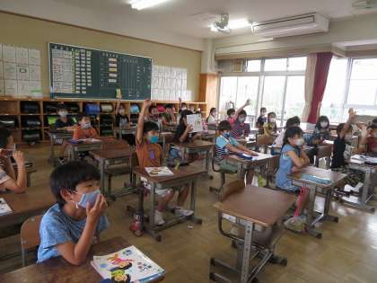 2年1組では,生活科の学習で地域のお店や施設を確認していました。知っている場所をみんなで出し合っていました。